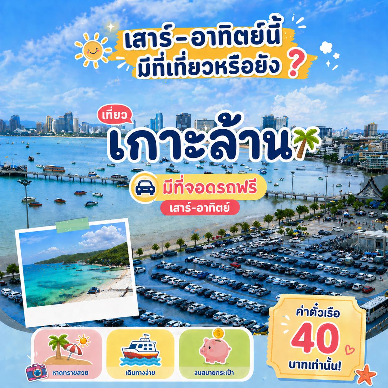 City officials have designated free parking areas for tourists traveling to Koh Larn on Saturdays and Sundays, aiming to reduce congestion and support domestic tourism.