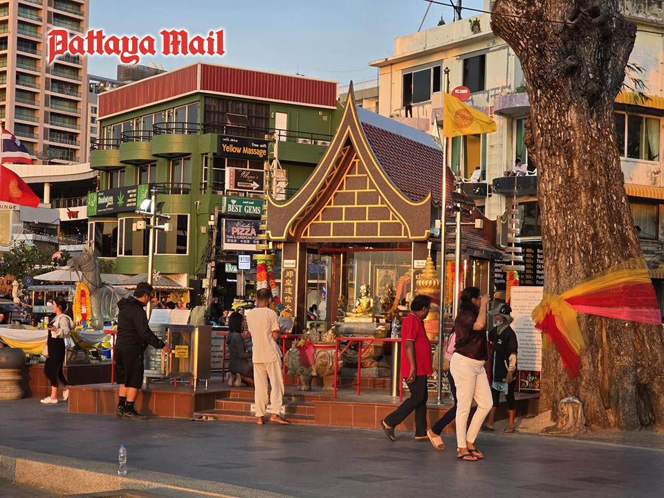 In Thailand, the belief in luck and spiritual rituals often competes with the value of hard work, with some turning to superstitions or begging for luck in the hope of overcoming challenges and gaining fortune. (Photo – Pattaya beach Soi 6 spiritual shrine)