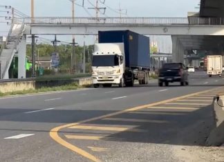 Police pull over 14-wheeler truck navigating against traffic on Bang Na–Trat...