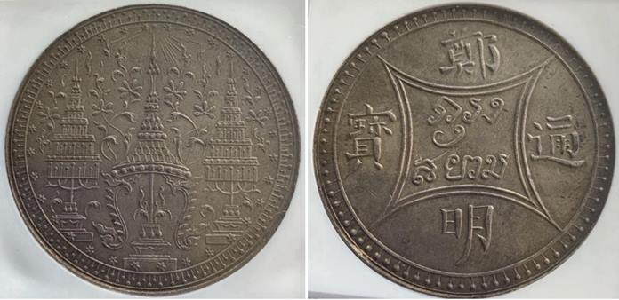 The reverse has the inscription, Krung Siam enclosed within a frame and the Chinese legend Cheng Ming Tung Pao outside the frame. “Cheng Ming” is the name of King Rama IV in Chinese and “Tung Pao” means “lawful money”. There are two types; one with the double-lined frame and dots around the rim, and the other with a single-lined frame without dots.