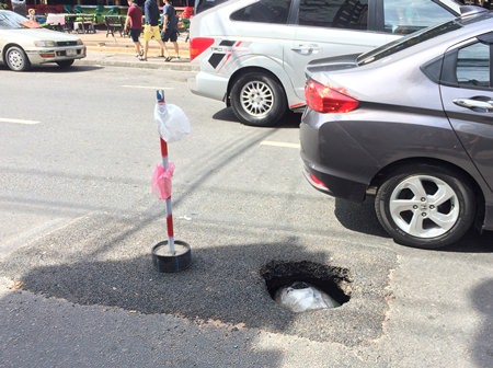 A deep, treacherous pothole has appeared at the Second Road intersection of Soi Honey (Soi 11). Someone tried to avoid a careless pedestrian suffering a broken leg by partially filling the meter-deep hole with a garbage bag. Someone also put a marker in front of it to avoid motorcycle accidents, even though bikes whiz within centimeters of the hole anyway.