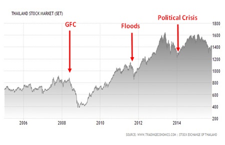 LTFs and RMFs invest into Thai equities markets, which have performed equally as well as the world’s major stock markets in recent times (see charts 2 & 3). The main stock market, the SET, has consistently been a reliable performer. It rebounded strongly from the impact of the Global Financial Crisis, the terrible flooding in 2011 and the political crisis in late 2013 and early 2014 (see chart 1).