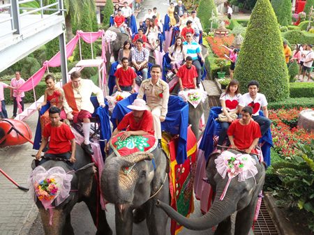 A hundred couples got their marriages off to bumpy starts when they took their Valentine’s Day wedding vows on the backs of elephants at Nong Nooch Tropical Garden.