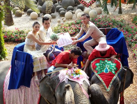 A hundred couples made their wedding vows extra special by reciting them on the backs of elephants on Valentine’s Day at Nong Nooch Tropical Garden.