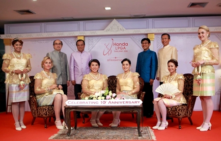 Six world-class and leading lady golfers joined a press conference at the Dusit Thani Pattaya on Feb. 23 to announce the 10th anniversary Honda LPGA Thailand 2016 ladies golf tournament.  The golfers, who included Thailand’s Pornanong Phatlum along with Anna Nordqvist from Sweden, Amy Yang and Chun In-gee from Korea, Japan’s Ai Miyazato and Charley Hull from England were all dressed in traditional Thai outfits for the occasion.