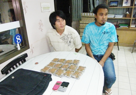 Sinrath Phathasri, 29, and Somprasong Chansaard, 30, were taken into custody Aug. 26 by officers patrolling near the intersection of Thappraya Road and Soi Marine Plaza who believed the duo were driving suspiciously.