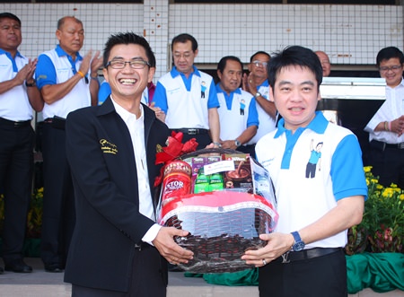 Pattaya City Manager Pakorn Sukonthachart (left), representing Pattaya officials and employees, gives a Happy New Year gift basket to Mayor Itthiphol Kunplome (right).