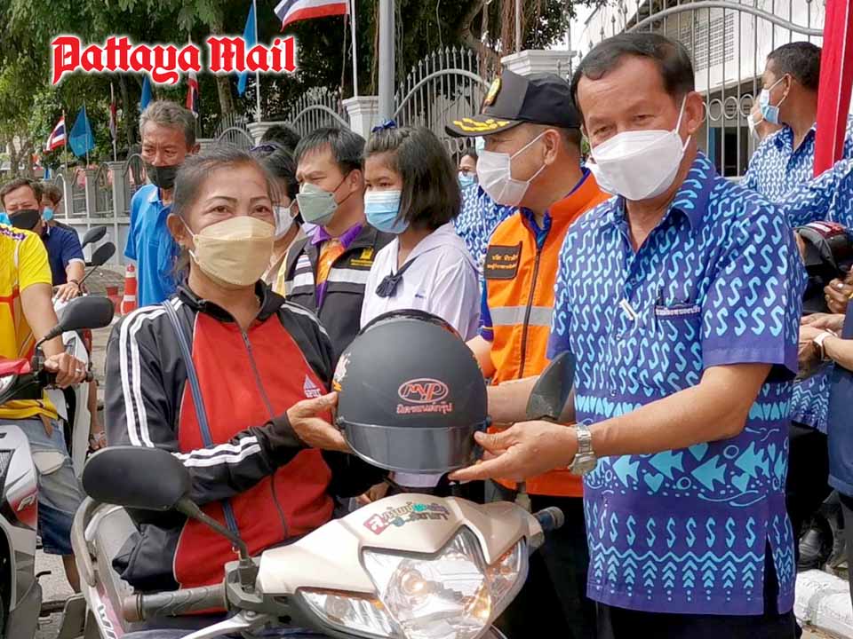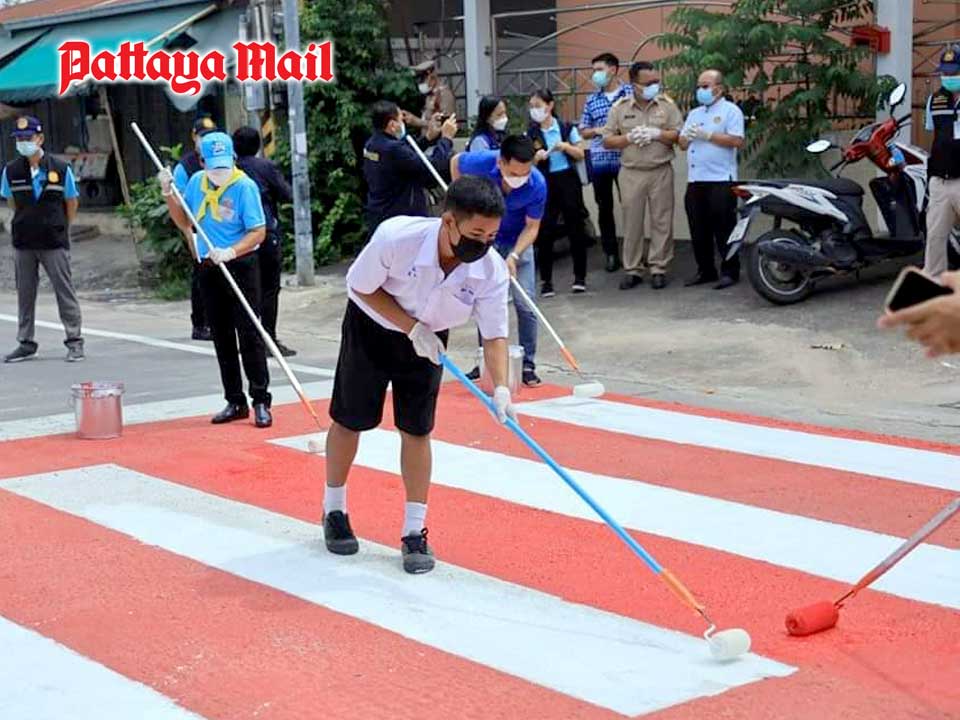 About 200 east Pattaya residents and officials gave away motorcycle helmets and repainted crosswalks to promote road safety.