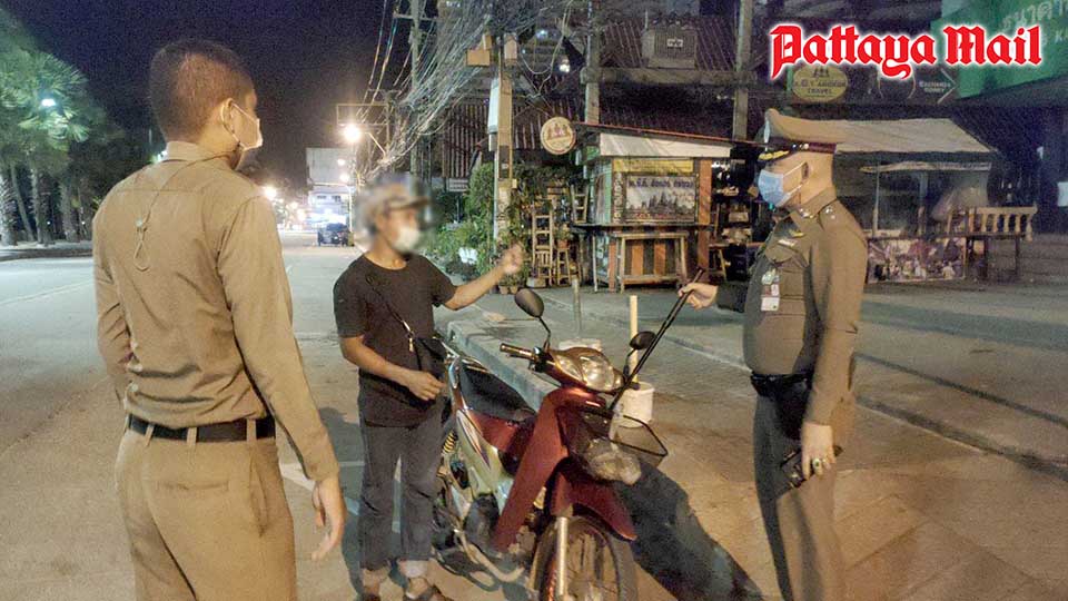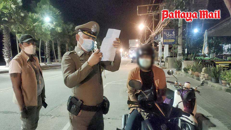 Chonburi and Pattaya police patrolling Jomtien Beach caught four Thais and three expats driving motorbikes and cars after 9 p.m. without documentation justifying their reasons for not being at home.
