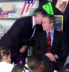 Chief of Staff Andy Card whispers into the ear of President George W. Bush to give him word of the plane crashes into the World Trade Center, during a visit to the Emma E. Booker Elementary School in Sarasota, Fla. (AP Photo/Doug Mills)