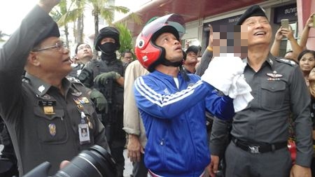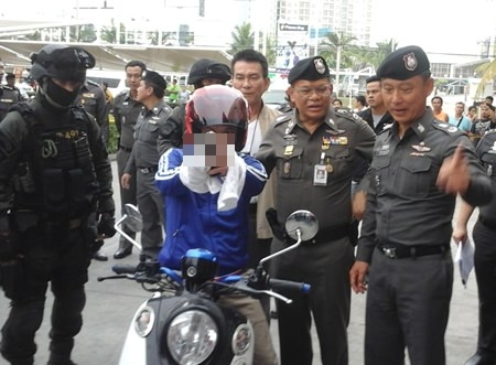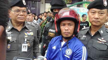 The apprehension of Sitidej Phomee of Uthai Thani, 40, was announced May 7 by top Royal Thai Police officers before he was led to the bank’s South Pattaya branch to re-enact the armed robbery of the Siam Administrative Management Co. (SAMCO) armored car, escaping with 8.8 million baht.