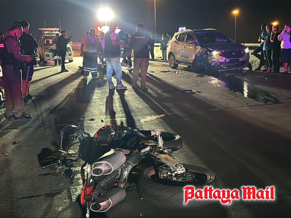 PATTAYA, Thailand – An American man riding a big bike was killed instantly in a head-on collision with a passenger car late Wednesday night on an overpass in east Pattaya.