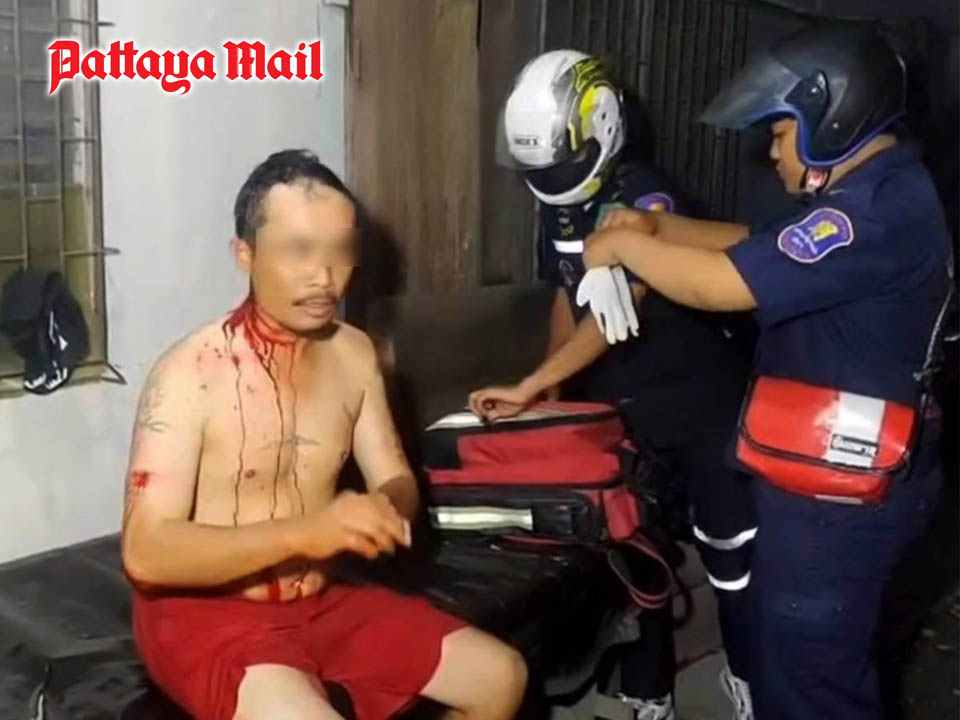 Sakda Ammart-hin, 35, suffered slash and stab wounds to the head and arm in the July 28 incident at a room rental house behind Nongprue Market. He was treated at Banglamung Hospital.