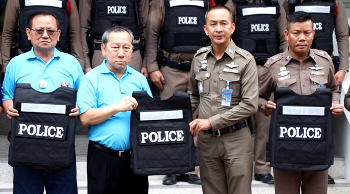 Deputy chief Pol. Lt. Col. Daranpob Srathongyu accepted the bullet-proof vests from Pairoj Prawatlertudom, chairman of the National Police Board of Banglamung.