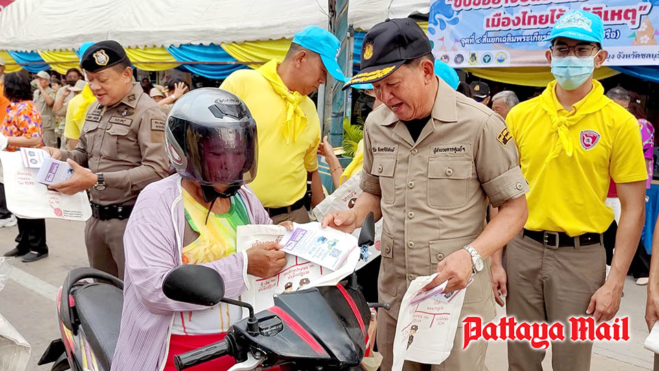 Furthermore, Banglamung District Chief Weekit Manarotkit and Nongprue Mayor Winai Inpitak led the distribution of informational pamphlets to promote safe driving practices. Emphasis was placed on wearing helmets, proven to reduce head injury risks by up to 43% for drivers and 58% for passengers. Free cloth bags were also distributed to pedestrians.