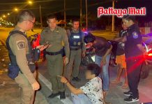 The motorbike driver, Nattakit Binyamat, 19, who was also injured in the crash, told police that was driving to meet friends on Third Road in North Pattaya, when the intoxicated woman suddenly ran across the road. Unable to brake in time, he collided with her. He was sent to Banglamung Hospital for treatment of his injuries.
