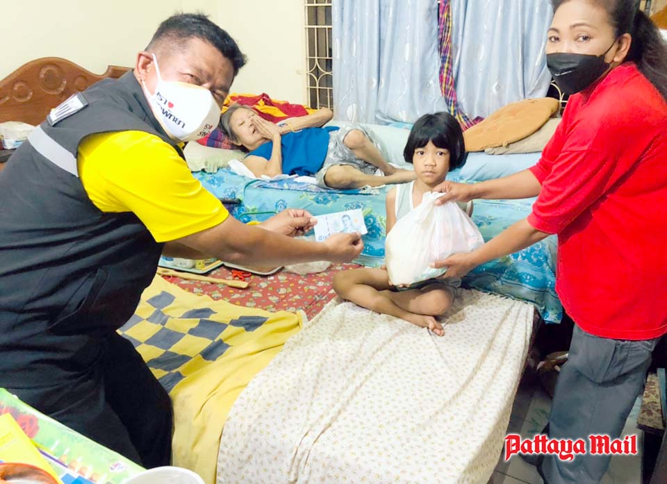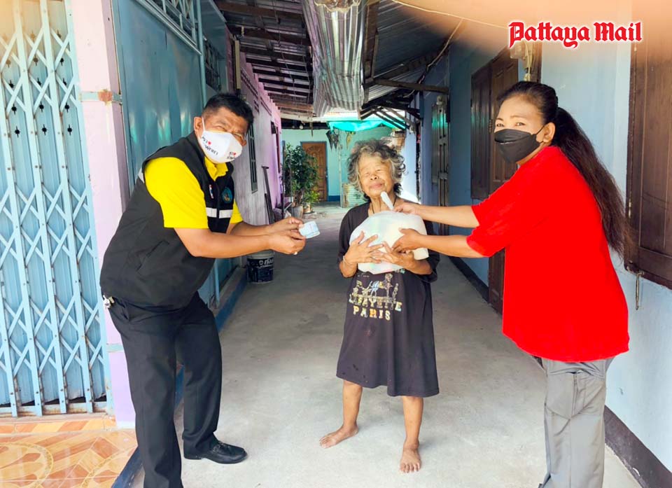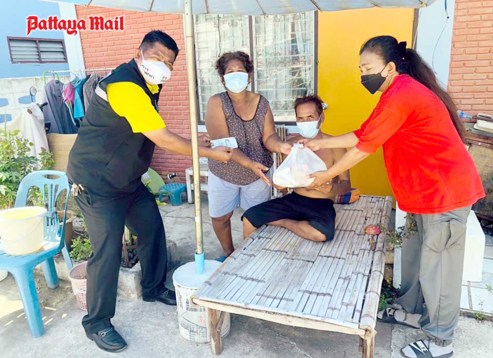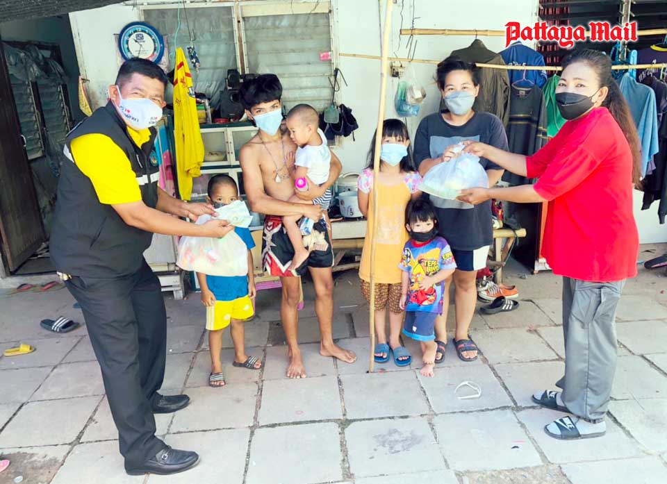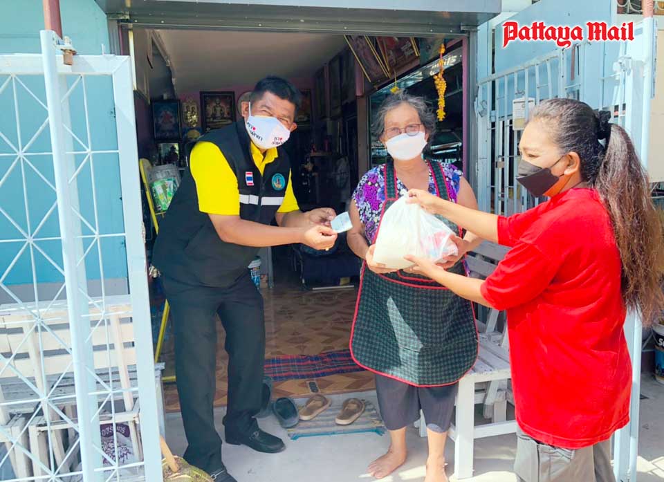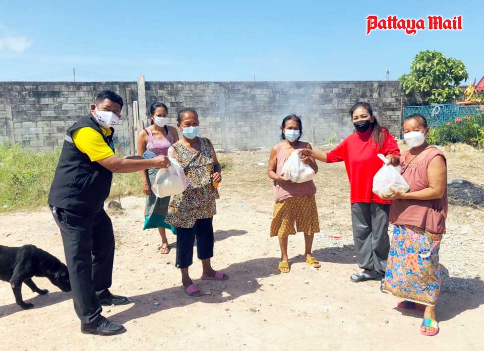 A volunteer team from city hall led by mayoral advisor Nikom Sangkaew represented a benevolent British long-term Pattaya resident in handing out 300 survival bags containing rice and dried foods to the destitute people living in the Soi Korphai community.