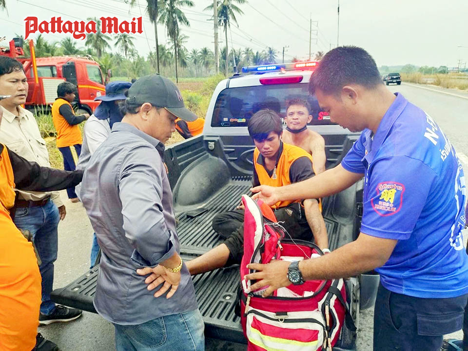 Reungrit Yendee, 27, and Sarawut Suksiri, 18, were vaulted off their platform truck and fell to the ground on Highway 331 entering Borwin. They were treated for electrical burns at a local hospital.