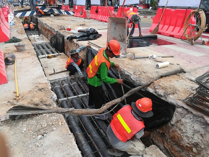 PATTAYA – The Provincial Electricity Authority has decided to work around the clock on weekdays moving power and utility lines below ground on Central Road to speed the project’s completion.