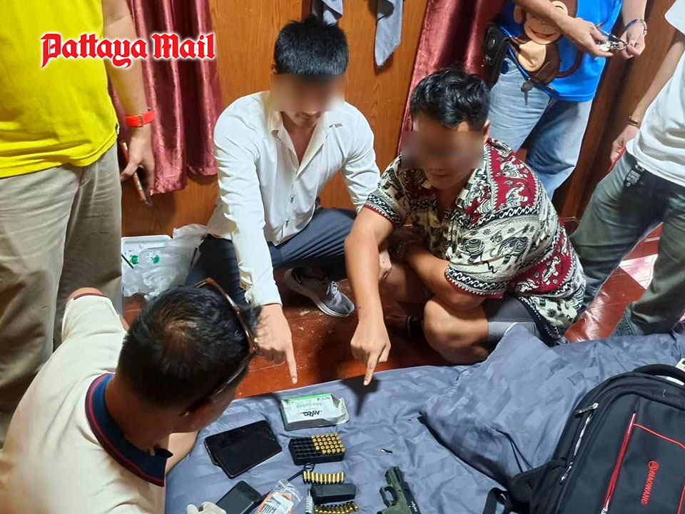 PATTAYA, Thailand – Pattaya and Chonburi police led a targeted operation on February 21, resulting in the arrest of Cai Qingqjng, 28, and Lei Chen, 28, two Chinese nationals who were in possession of a 9mm semi-automatic pistol, two magazines, handcuffs, ammunition, and a shoulder bag containing various items.