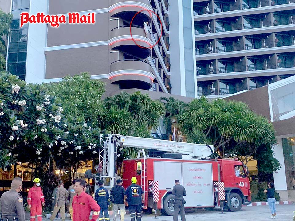 Pattaya police were alerted when bystanders saw a man standing outside the 3rd floor balcony of the First Pacific Hotel on Pattaya Central Road on May 31, apparently threatening to jump off.