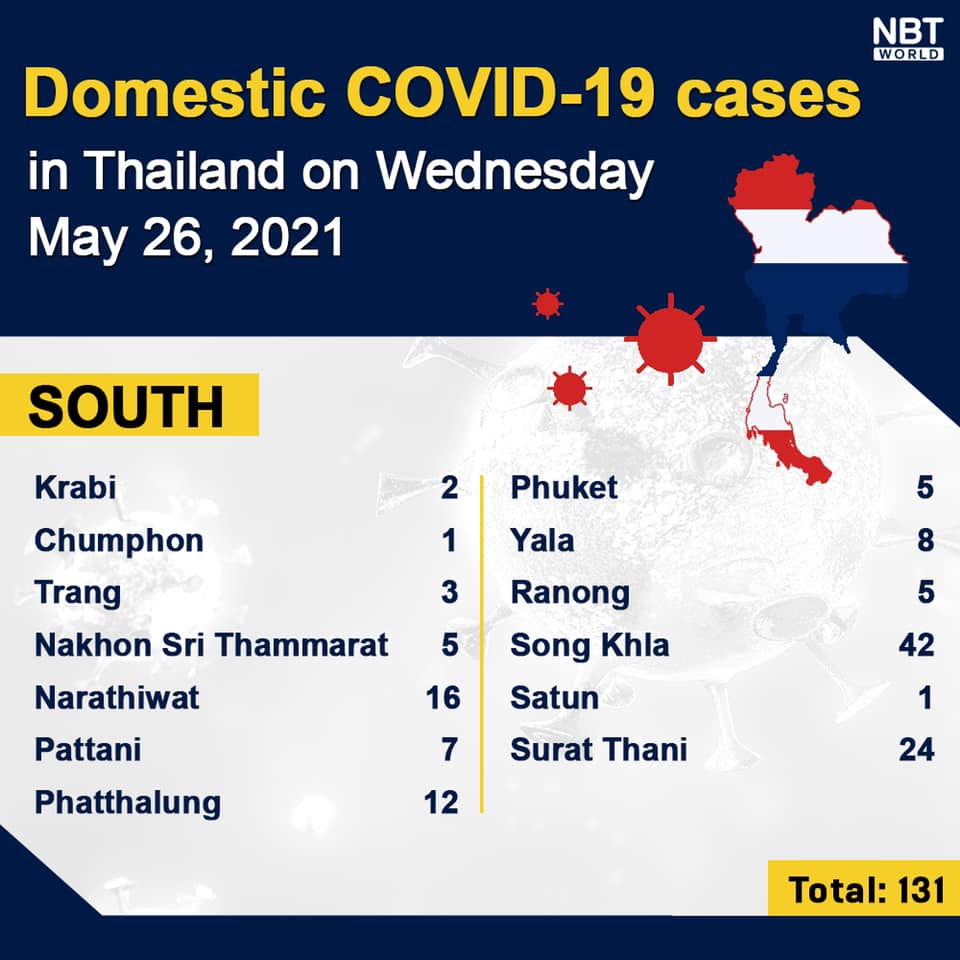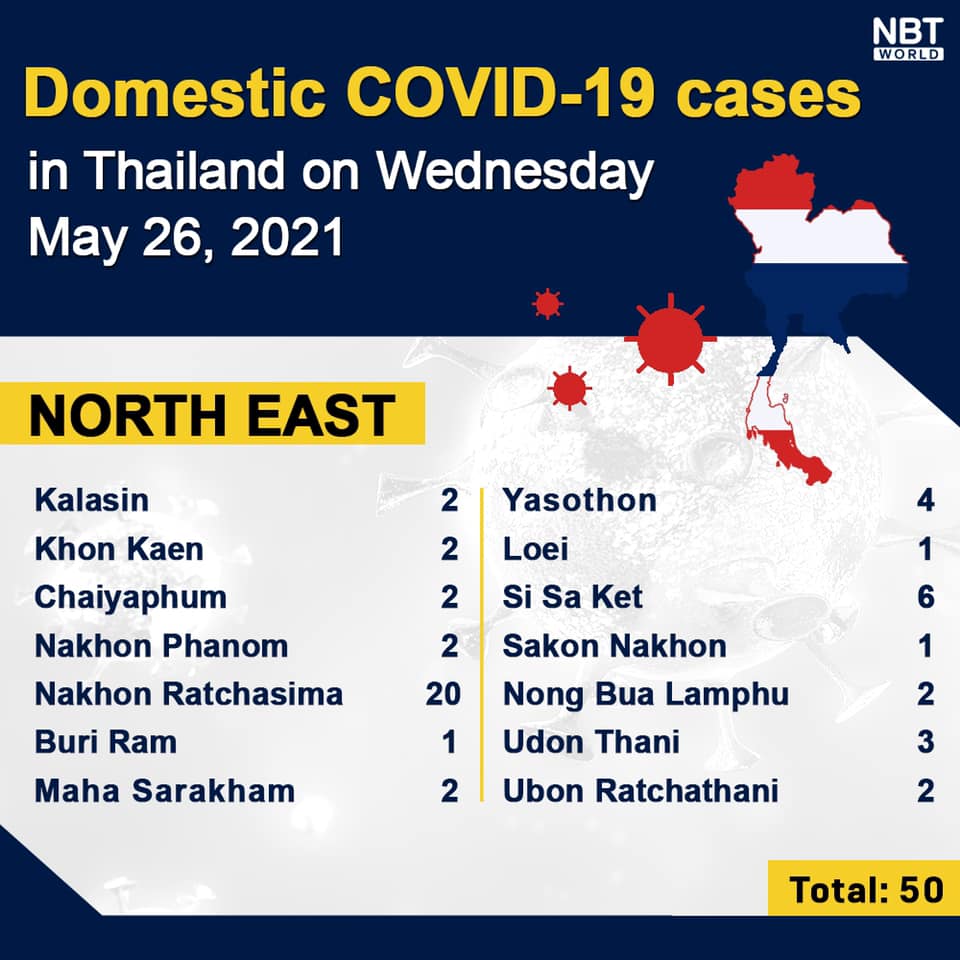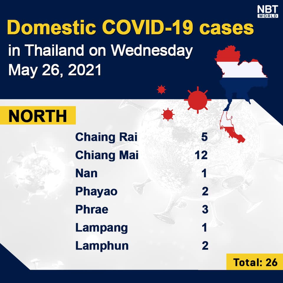 Chiangmai MailNewsPattayaUpdate COVID-19 Chonburi detects 40 new cases while Bangkok finds 975 and Chiang Mai 12 today By Pattaya Mail May 26, 2021 0 1825 Share on Facebook Tweet on Twitter tweet Each province’s daily domestic COVID-19 cases update in Thailand on Wednesday. Total: 2,457