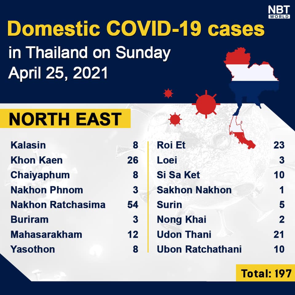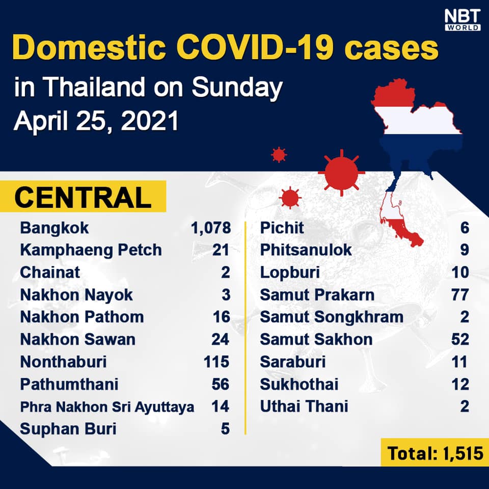 NewsPattayaUpdate COVID-19 Chonburi detects 75 new Covid-19 cases while Bangkok remain on top with 1,078 on Sunday By Pattaya Mail April 25, 2021 0 1365 Share on Facebook Tweet on Twitter tweet Each province’s daily domestic COVID-19 cases update in Thailand on Sunday is at 2,433 (NNT)