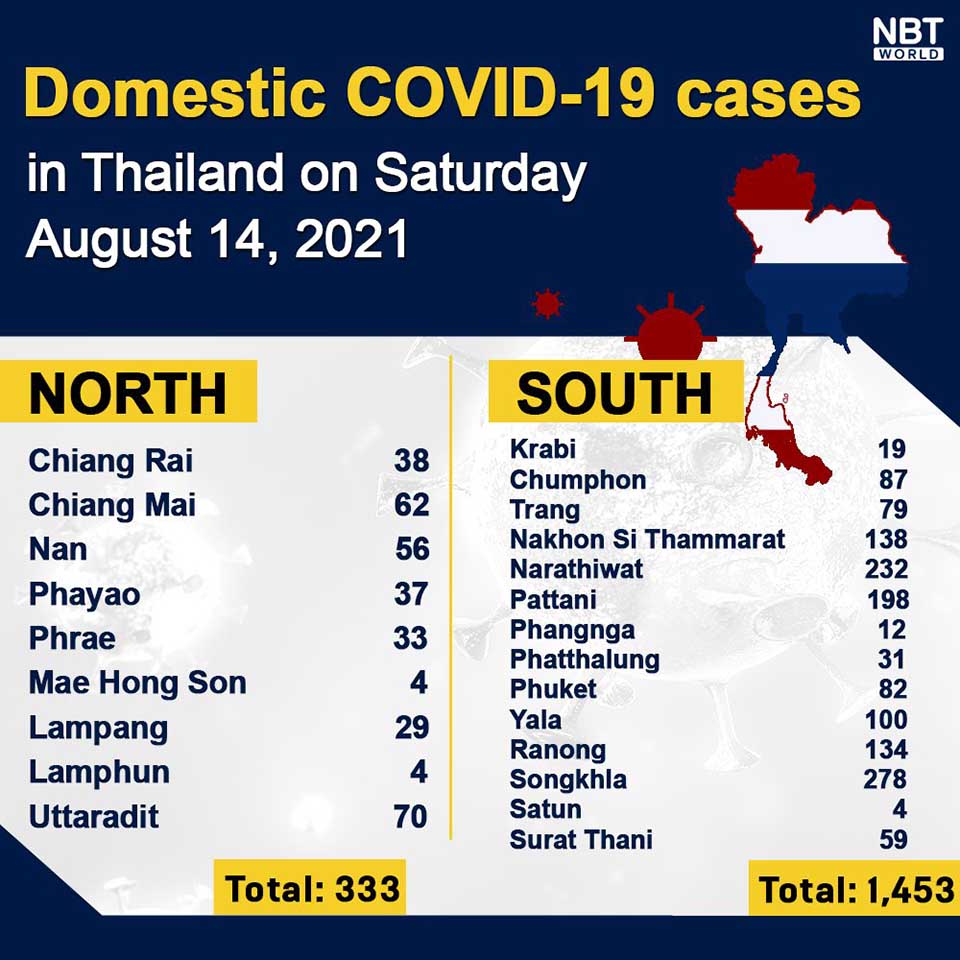 Chiangmai MailNewsPattayaUpdate COVID-19 Chonburi logs 1,254 new cases, Bangkok 5,088, Phuket 82 and Chiang Mai 62 today By Pattaya Mail August 14, 2021 0 1829 Share on Facebook Tweet on Twitter tweet Each province’s daily domestic COVID-19 cases update in Thailand on Saturday. Total: 22,083