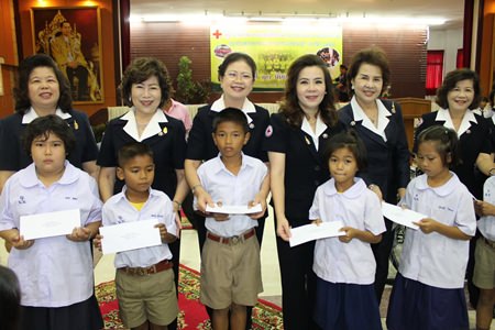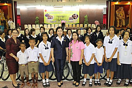 Red Cross Vice-President Sasithorn Preechawit leads members of the Chonburi Red Cross in handing out a million baht in scholarships and providing free bicycles.