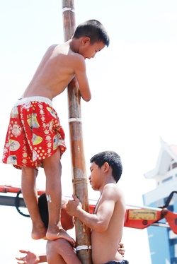 Using teamwork to climb the greased pole and retrieve the 100 baht note at the top.
