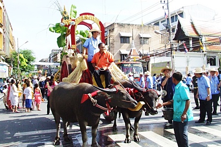 Governor Wichit Chatpaisit arrives on a farmer’s cart drawn by water buffalo during the opening day parade.