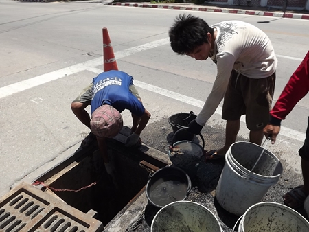 The workers opened each drainage cover along Third Road in central Pattaya, checking and inspecting pipes. Employees took turns going underground to do the dirty work, passing up sand to be hauled away.