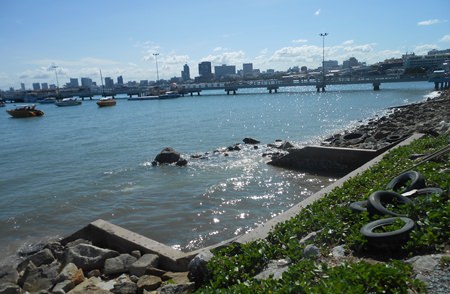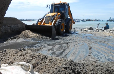 Mayor Itthiphol Kunplome led Sanitation Engineering Department staffers to the pier Aug. 5 for the job to clear sand, garbage and natural debris from the tail ends of the pipelines carrying water from eastern parts of the city.