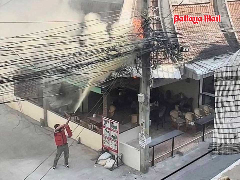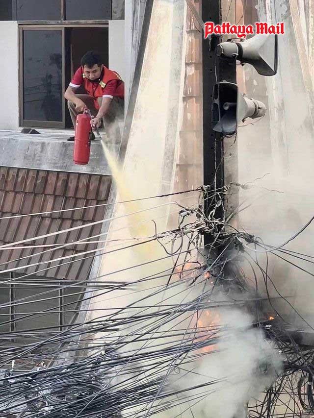 PATTAYA, Thailand – A civic officer from Jomtien district, has earned the admiration of Pattaya locals for his courageous response during a recent fire emergency. The incident unfolded on the evening of April 22, during Chalathon Moryathai’s day off. While working as a motorcycle taxi to earn extra income near Soi 16, Central Pattaya, he heard cries for help and noticed a blaze erupting from overhead communication cables.
