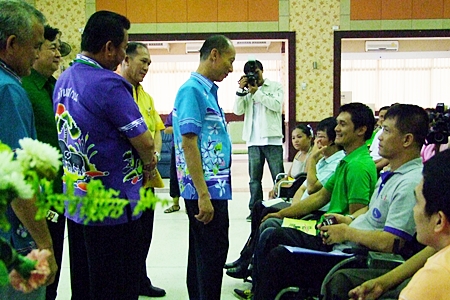 Gov. Khomsan Ekachai talks with disabled residents at Chalerm Prakiet Pavilion in Chonburi.