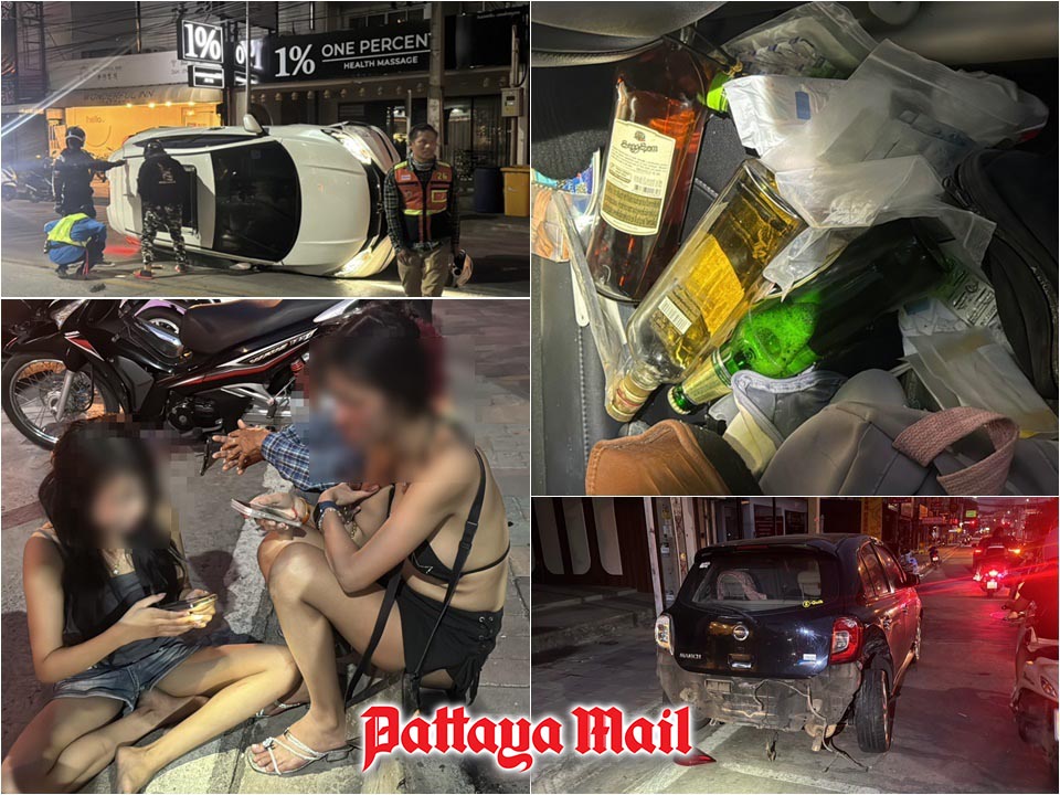 PATTAYA, Thailand – A suspected drunk driver lost control of an SUV and flipped it onto its side in the early hours of March 11 on Pattaya Third Road, leaving two people injured but alive.