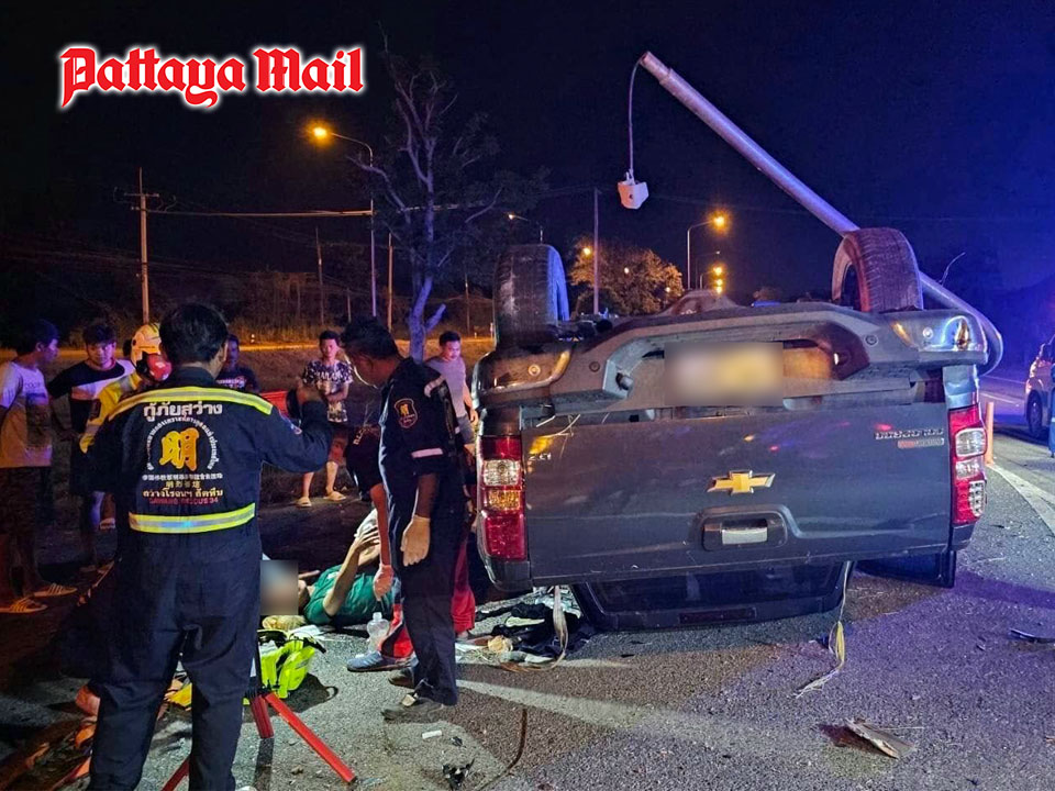 SATTAHIP, Thailand – A Chevrolet pickup truck lost control while traveling on Highway 332 heading toward the Je intersection, near the Miranda Village in Sattahip, on the night of December 18. The vehicle veered off the road, collided with two streetlight poles, and flipped over onto its roof, with its wheels pointing skyward.