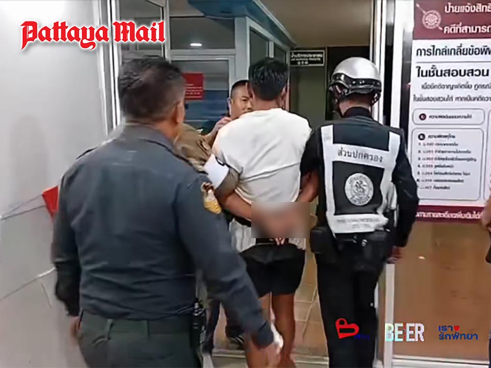 Pattaya municipal enforcement officers quickly arrived at the scene and coordinated with Pattaya Police to subdue the man. However, during the process of taking him into custody, the suspect suddenly grabbed a pen from one officer’s shirt pocket and stabbed the officer’s hand, causing injury.