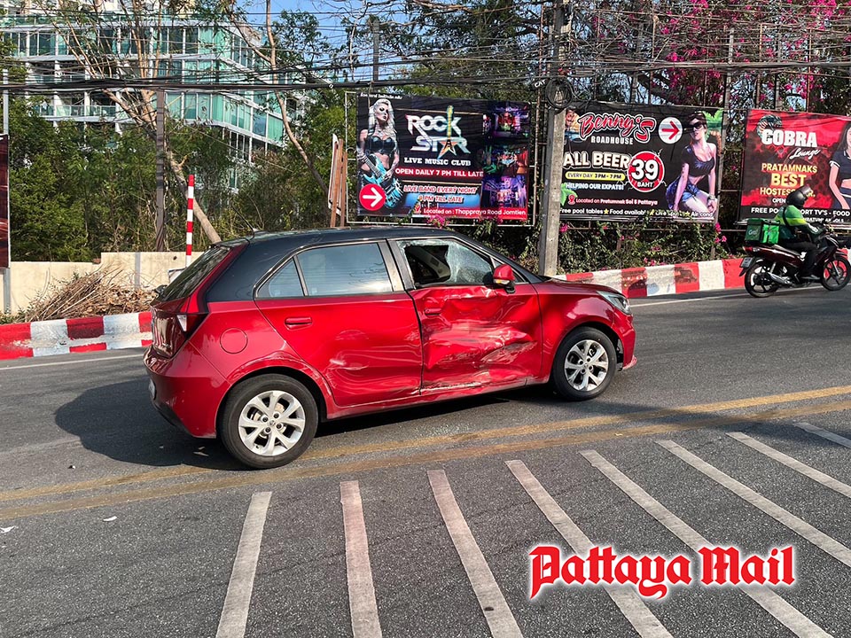 PATTAYA, Thailand – Pattaya Tourist Police rushed to assist at the scene of a road accident on April 15 after receiving reports of a collision between a car and a motorcycle on the downhill section of Pratumnak Hill.
