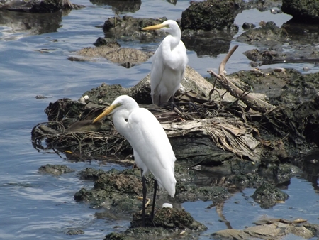 Residents said it was a rare sight to see the dozens of birds there and bird watchers took advantage of the opportunity to watch their behavior and routine. Pure white with long necks and beaks, the egrets use their long beaks to catch small fish, crab, shrimp and other sea creatures.