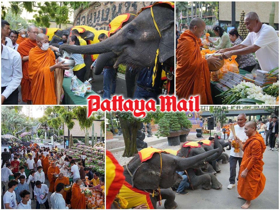PATTAYA, Thailand – In celebration of New Year 2024, Nong Nooch Tropical Garden in Pattaya organized a merit-making ceremony on January 2, featuring nine elephants. Led by garden president Kampon Tansajja, the executive team, staff, tourists, and elephants participated in offering dry food alms to 19 monks from nine different temples.