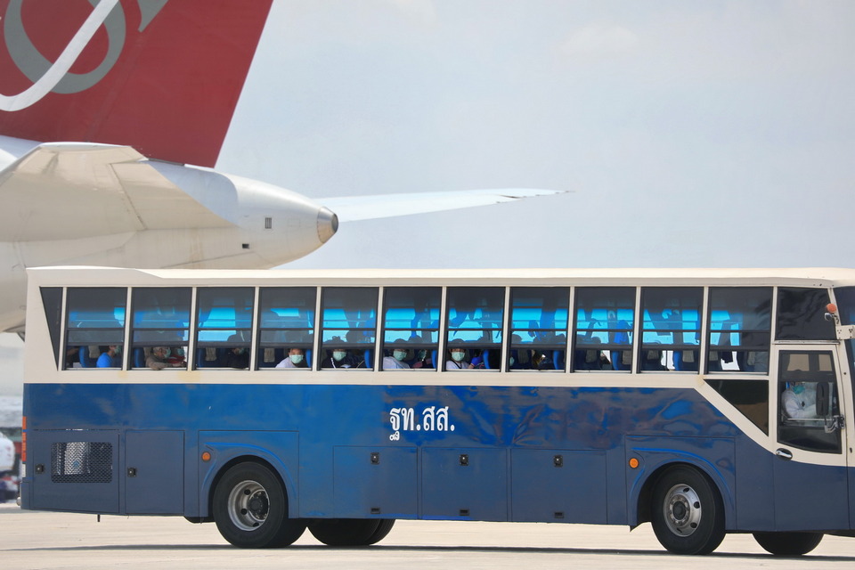 Upon disembarking from their charter flight at U-Tapao-Rayong-Pattaya Airport April 19, the arrivals endured health screenings and being sprayed with sanitizer before boarding three buses to a quarantine facility in the Najomtien/Pattaya area where they will remain for 14 days.