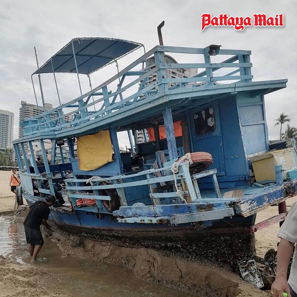 Strong winds and heavy rain send large boats ashore on Pattaya Beach, authorities coordinate rescue.