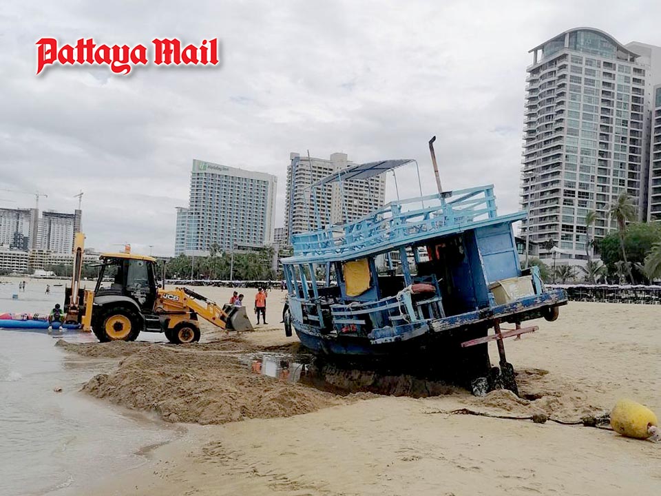 Pattaya municipal officers and boat owners work together to tow stranded vessels back to sea after overnight storm.