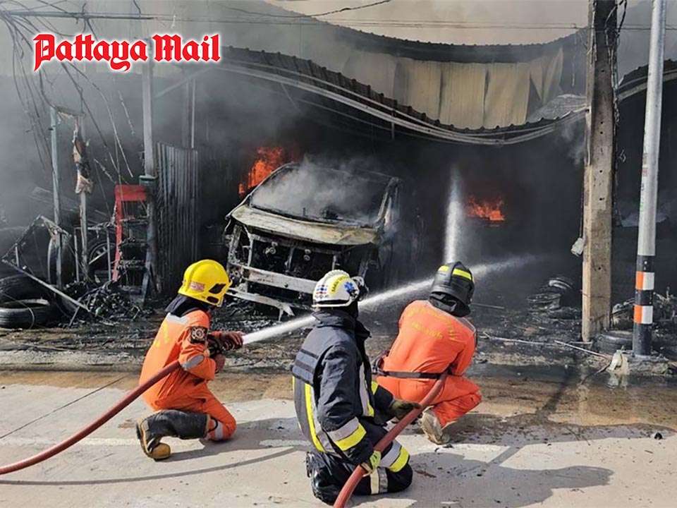 Fire destroys five cars at Pattaya auto garage after fuel drain error