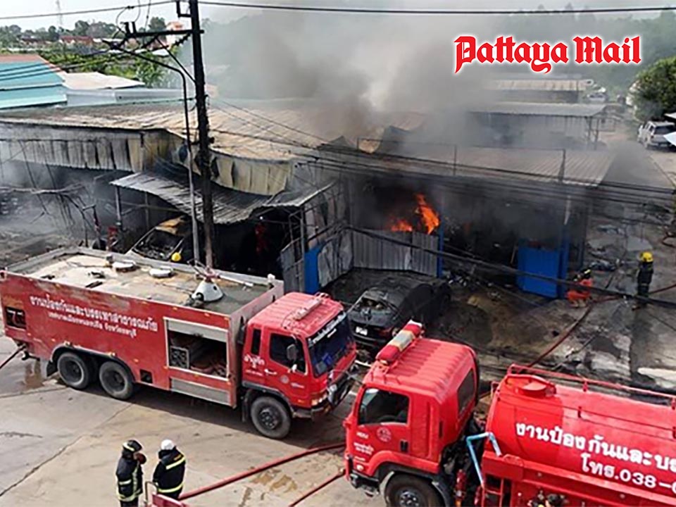 PATTAYA, Thailand – A massive fire broke out at Sompote Service, a car repair shop and tire center on Pornprapanimit Road (Soi Siam Country Club), East Pattaya, destroying five vehicles and injuring two people in a chaotic afternoon incident, July 13.