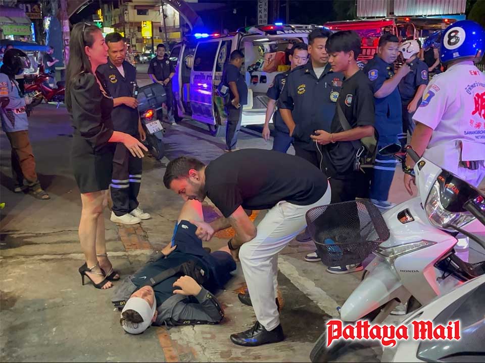 Police from Pattaya City Station responded to reports of a brawl outside a restaurant on Jomtien Road. At the scene, 32-year-old British national was found injured with a torn left ear and multiple bruises across his body. Rescue volunteers provided first aid before transporting him to Bangkok-Jomtien Hospital.