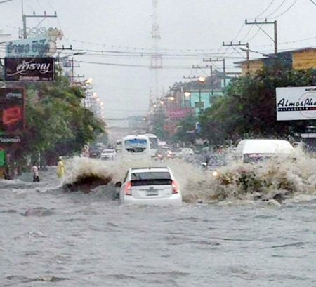 Soi Khao Talo was turned into a raging river. Several motorbikes and cars were damaged, but nobody was reported injured. Sukhumvit Road near the Highway Department was flooded as usual, ranging from 50-100 centimeters, disabling all vehicles, regardless of size, from rushing through.