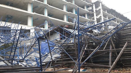 Floodwaters caused a large scaffolding to collapse at a condominium construction site, smashing into the temporary homes of construction workers.