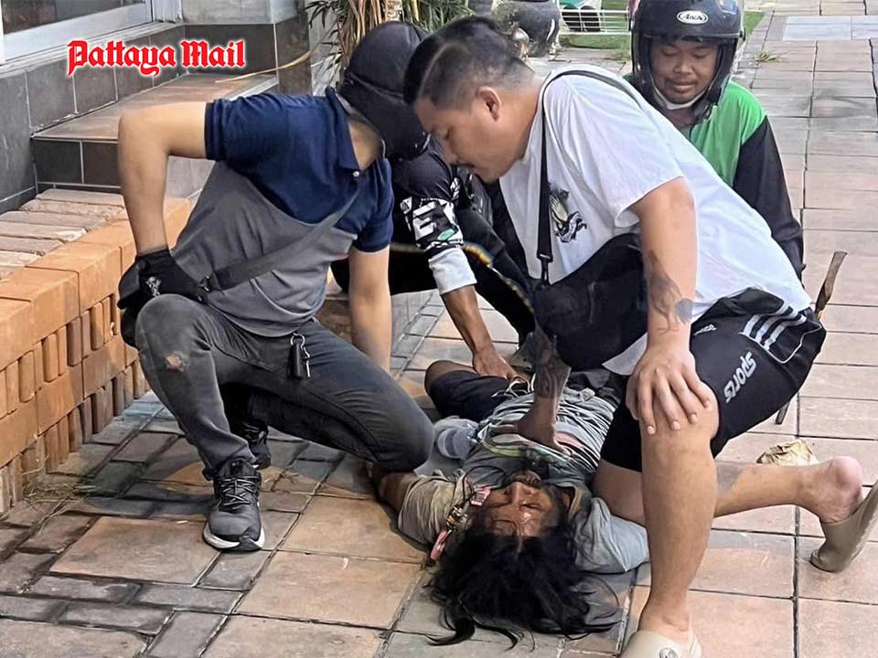 Local residents subdue a homeless man who assaulted an insurance claims adjuster with a wooden plank on Soi Pratumnak 5 in South Pattaya, inflicting severe injuries that required hospitalization.